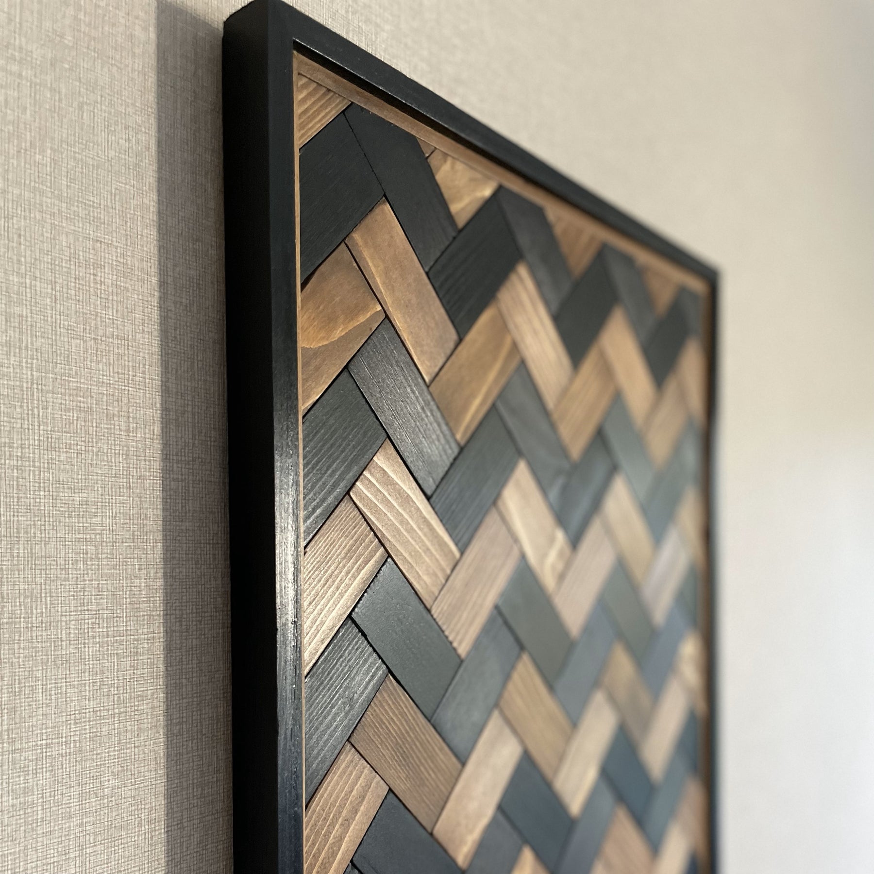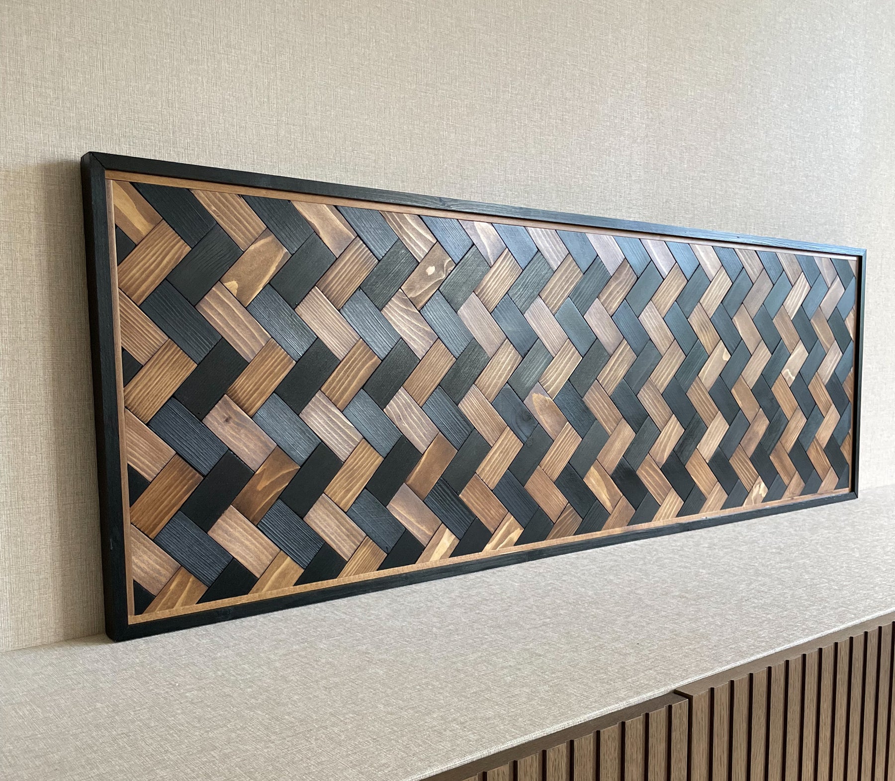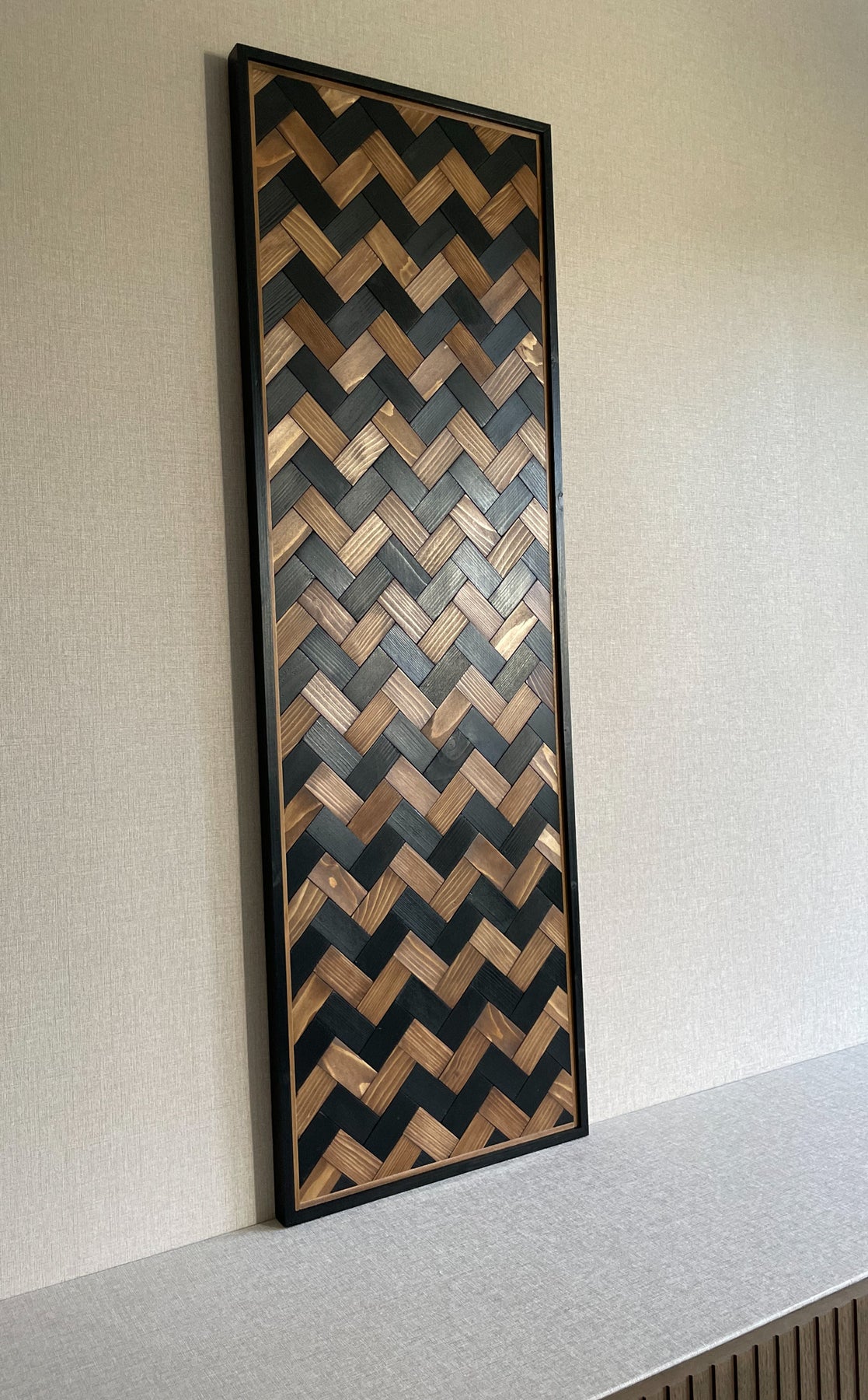 Titel: 'BOHO ART' Woodart Afmeting: 45 cm * 125 cm Kleur: matzwart & wengé. Afgewerkt: Duurzame transparante beschermlaag.