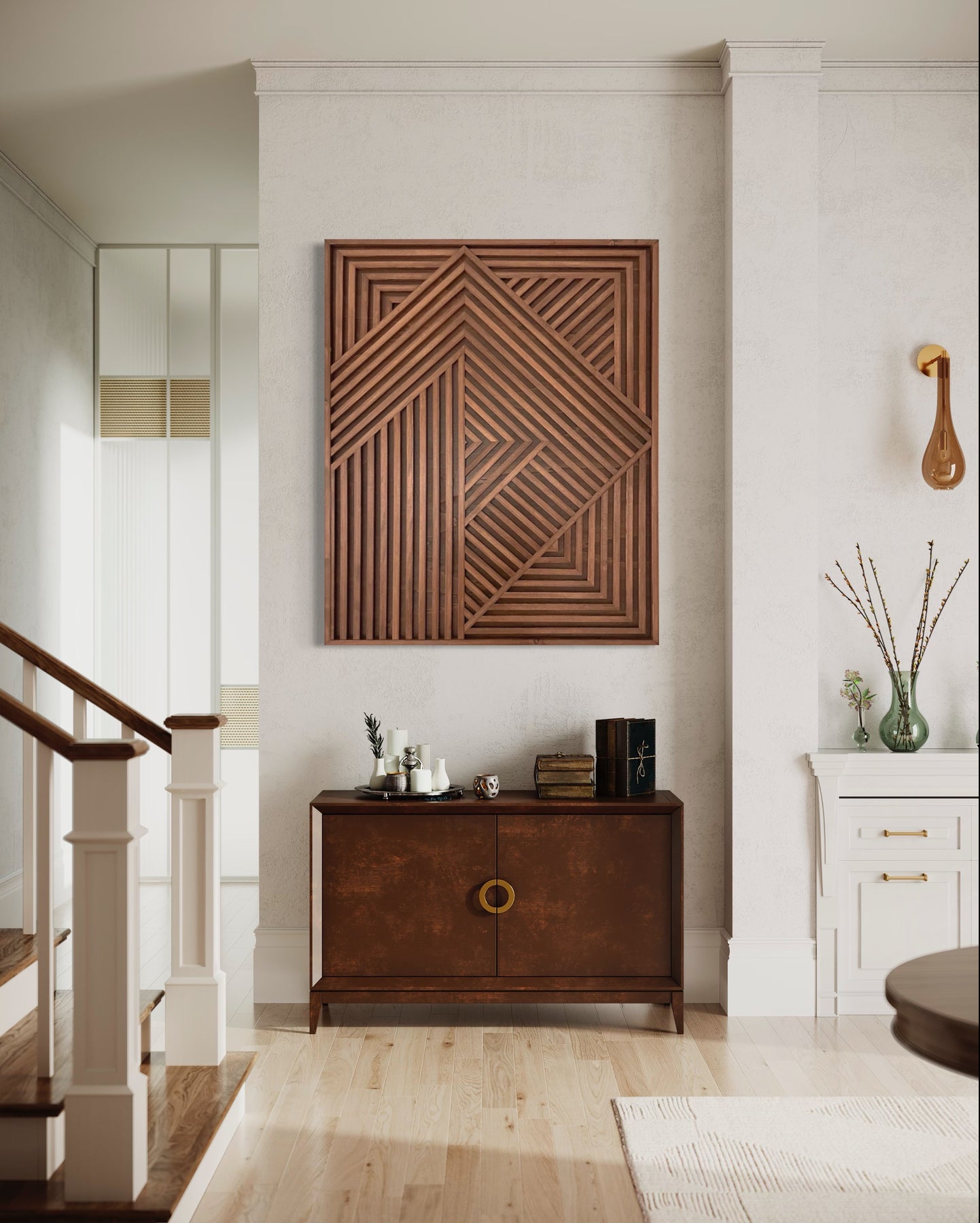 Het houten kunstwerk aan de muur past in ieders interieur. Of je inrichting geïnspireerd is op een Scandinavische woonstijl, minimalistische woonstijl of juist meer een Bohemian interieur heeft. Onze unieke wandpanelen leggen de adembenemende schoonheid van hout vast, en ze zijn op maat gemaakt voor jouw interieur, of het nu thuis is of op kantoor.