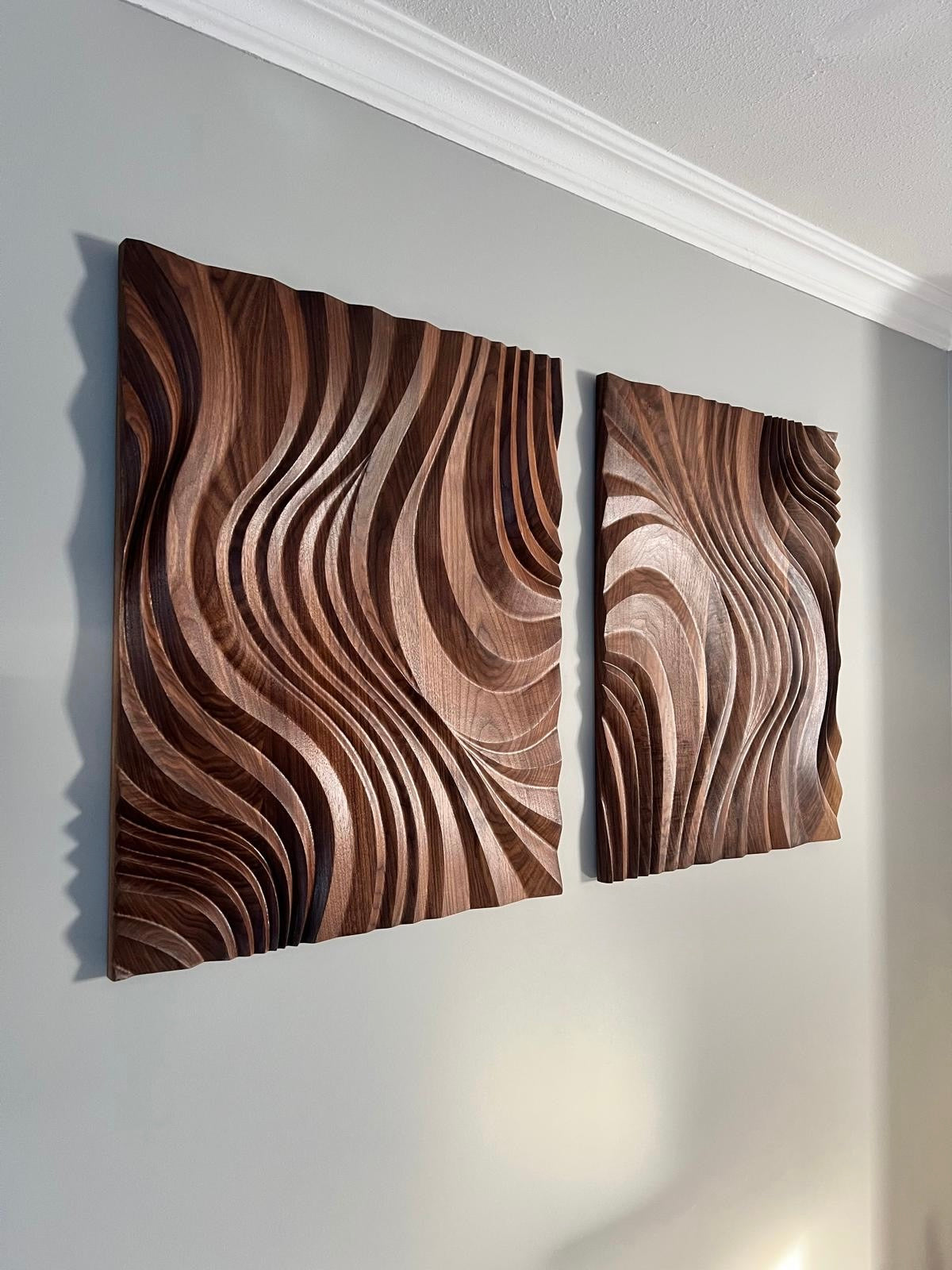 Das Holz ist in feinen Schichten abgetragen – die entstehende Struktur hat etwas Geologisches, etwas Geduldig-Entstandenes, das dem Wandbild eine stille Autorität gibt.