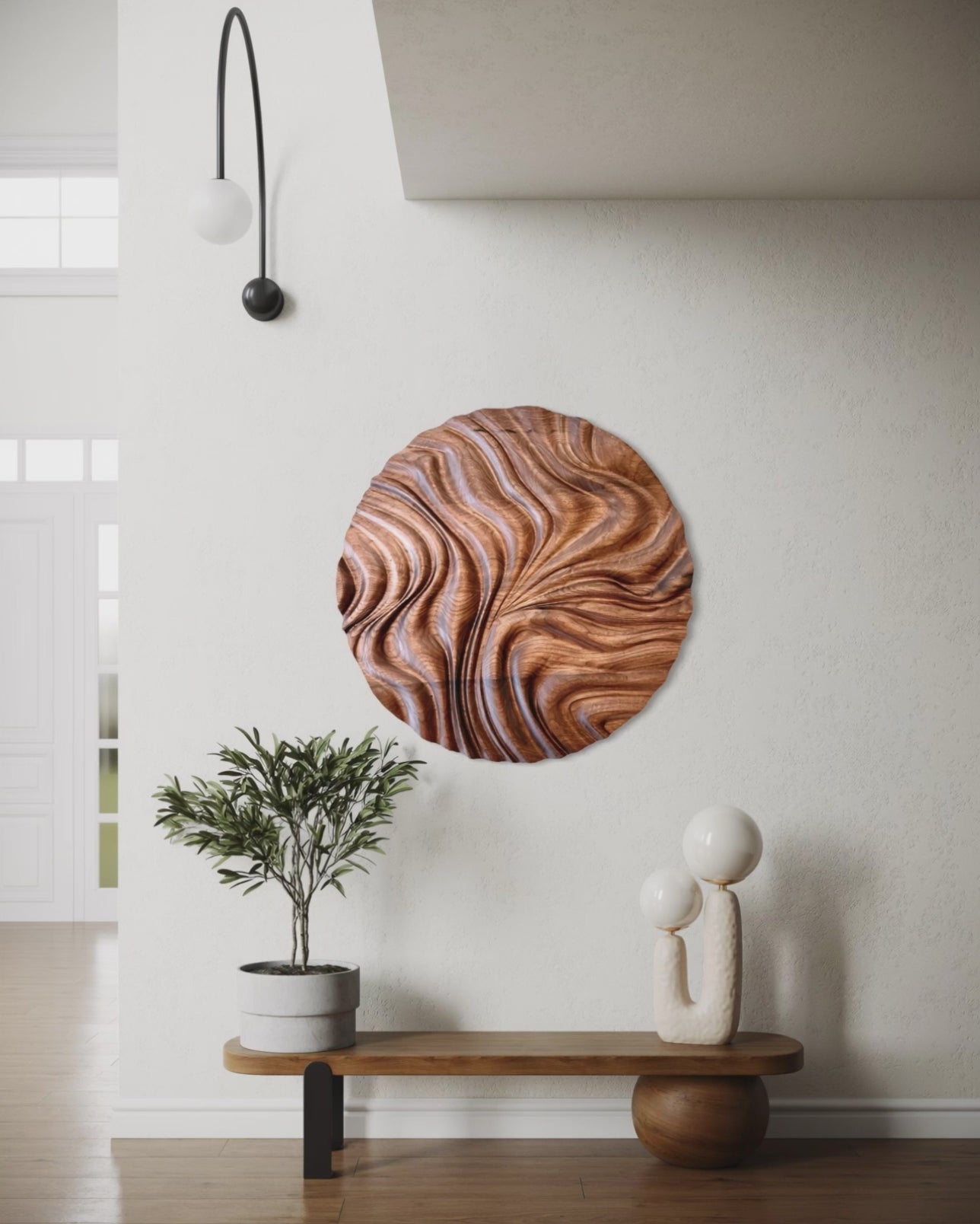 Organische Linien, wie von Gezeiten geformt, ziehen sich sanft über das runde Holzrelief. Die natürliche Maserung des Holzes verstärkt diese Bewegung und lässt das Kunstwerk je nach Lichteinfall lebendig erscheinen.