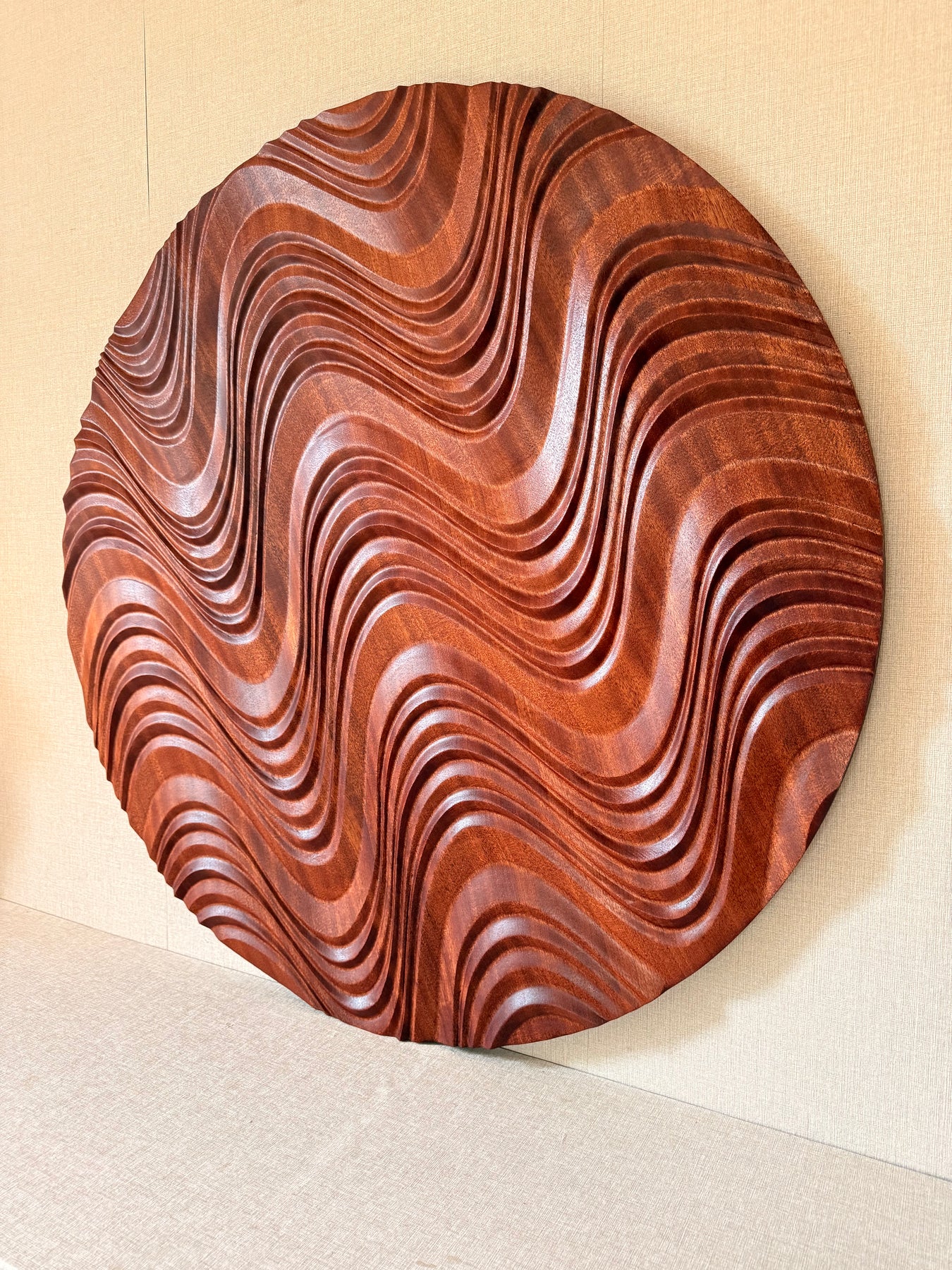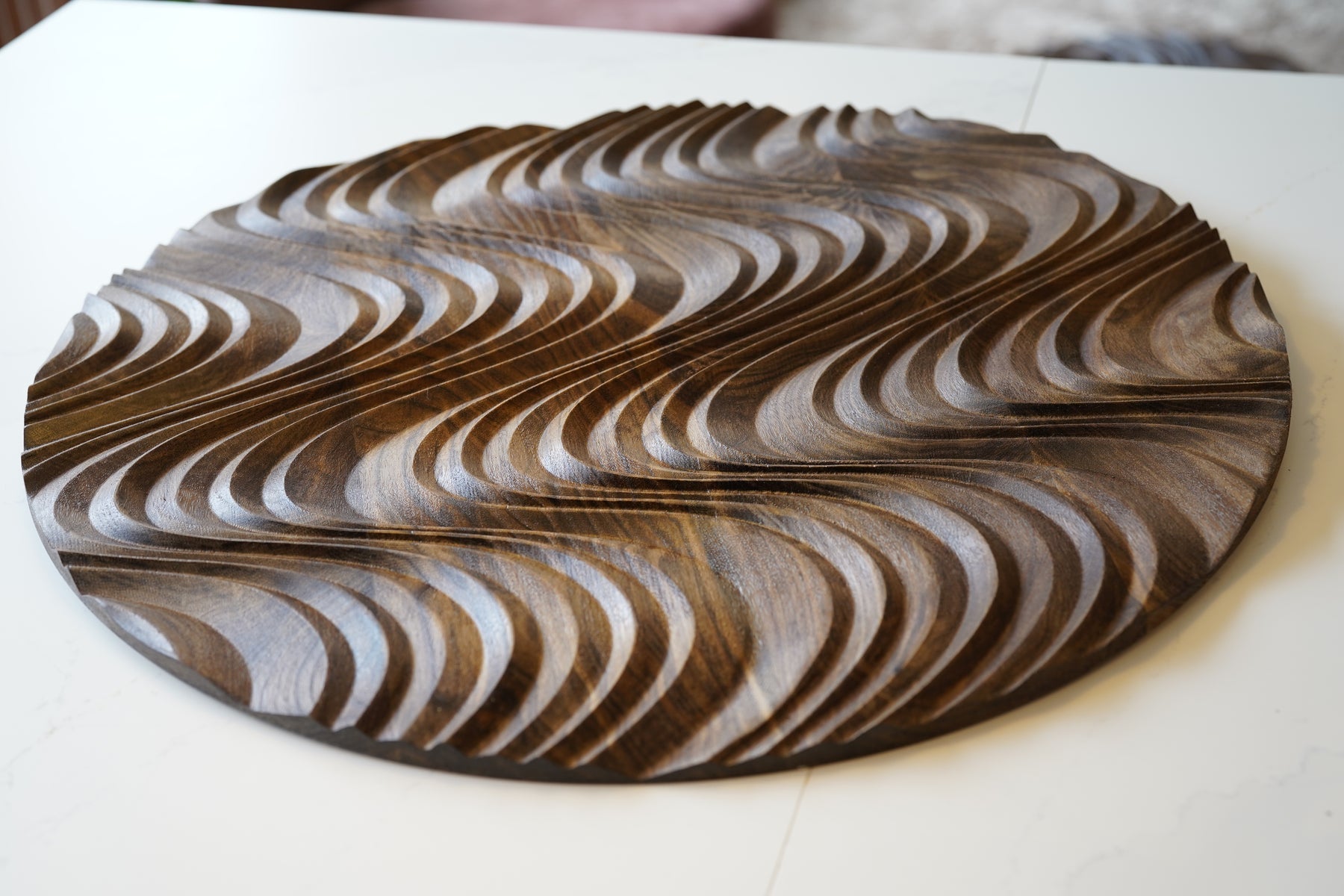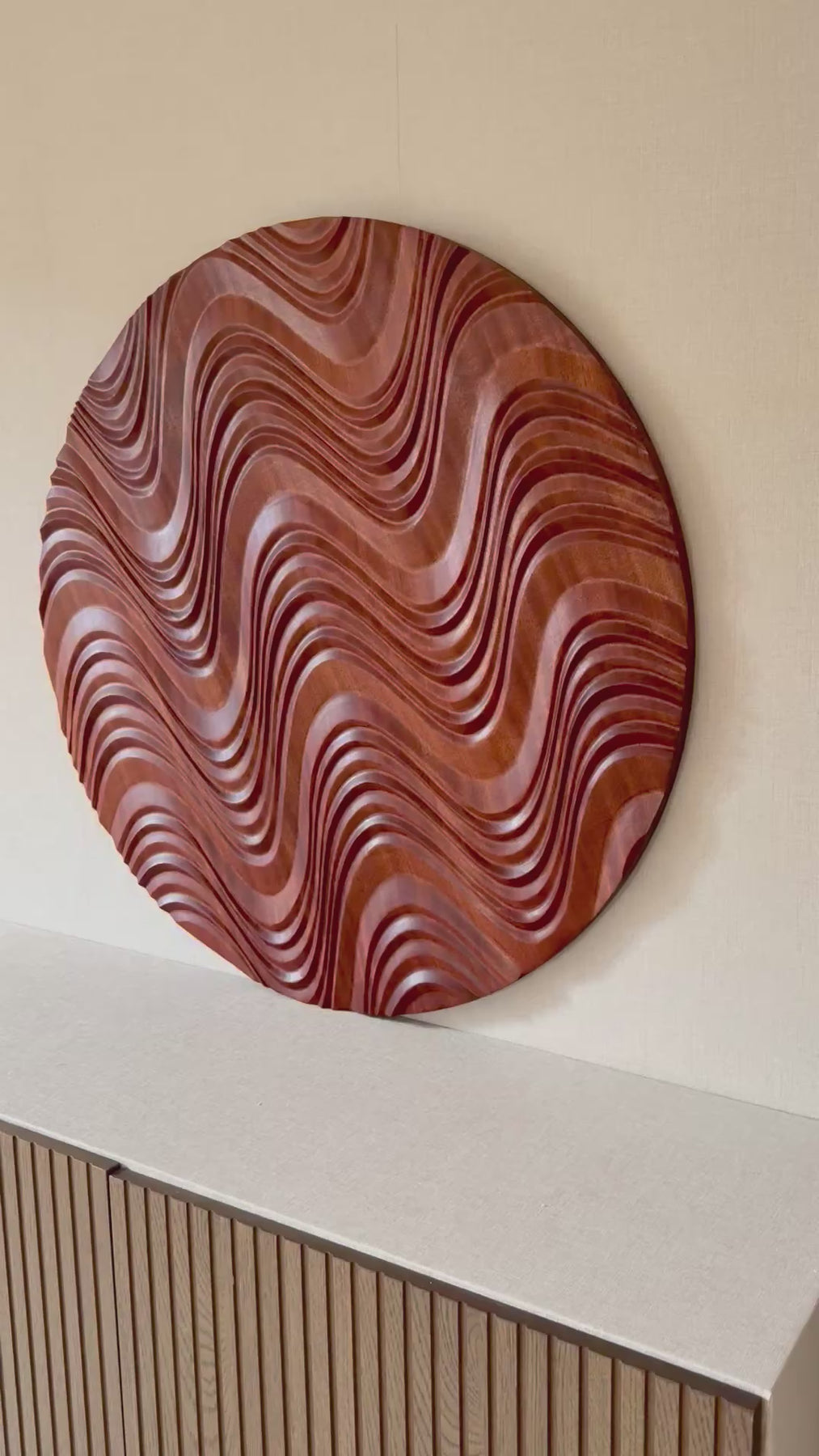 Wellen, die sich formen, brechen und zurückziehen – dieses stetige Wechselspiel aus Kraft und Stille spiegelt sich in den geschwungenen Relieflinien wider. Die natürliche Holzstruktur erzeugt ein feines Spiel aus Schatten und Tiefe, das sich mit dem Licht verändert.